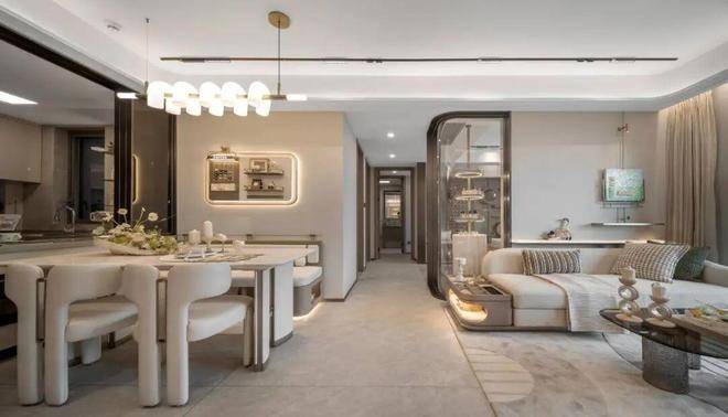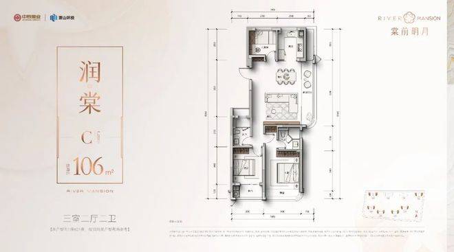 - 94㎡三房:三开间朝南,南向面宽近10米,1.5米进深阳台,独创“S墙”嵌入双开门冰箱。