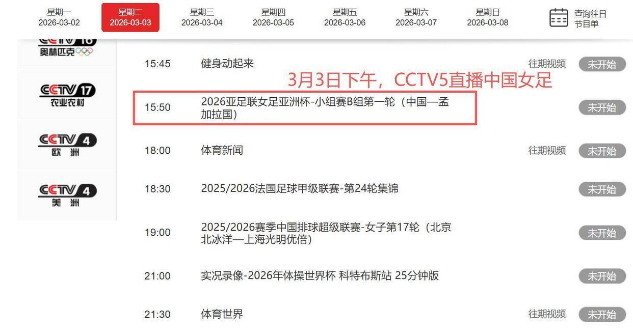 2026-03-04雨燕直播,NBA直播,世界杯直播,足球直播,台球直播,体育直播,世界杯,欧洲杯,苏超直播,村BA直播,苏超联赛,村超,村超直播下午四点,央视CCTV5准时直播! 卫冕冠军中国女足正式开启2026年女足亚洲杯征程,首战对手是首次闯入正赛的孟加拉国队。 这不仅仅是一场小组赛,更是“铿锵玫瑰”时隔四年后,再次向亚洲之巅发起冲击的起点。 作为亚洲杯历史上最成功的球队,九冠在手的中国女足,能否在米利西奇的带领下,延续在亚洲杯首轮赛事中“16战不败”的传奇纪录? 所有的目光,都聚焦在北京时间3月3日16:00的西悉尼体育场。